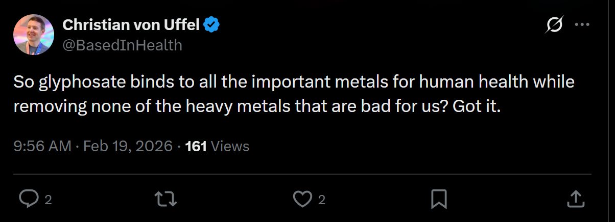 Jessica Rose posted a thread on X on February 18th that strips the science down to something anyone can track. Glyphosate's chemistry didn't begin in agriculture. Stauffer Chemical Co. patented it in 1964 as a chelating agent — a pipe descaler, used industrially to grab mineral deposits and pull them off metal surfaces. Monsanto licensed the chemistry and repurposed it as a herbicide a decade later.