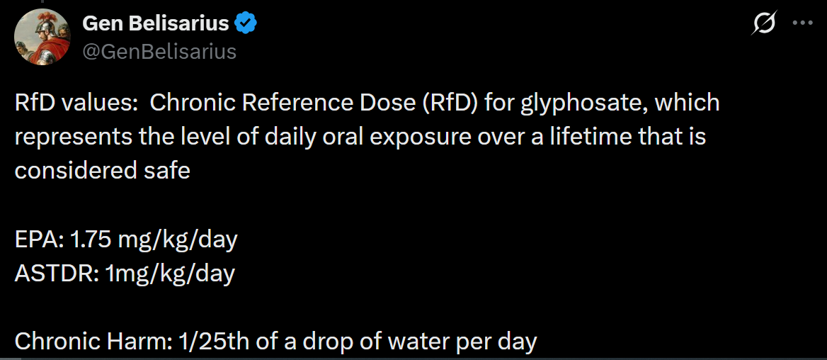 Gen Belisarius (@GenBelisarius) put the dose question in stark terms on X: the EPA chronic reference dose is 1.75 mg/kg/day. The Agency for Toxic Substances and Disease Registry (ATSDR) is 1 mg/kg/day. Chronic harm has been documented at one twenty-fifth of a single drop of water per day — sustained over a lifetime. The "quart of Roundup" argument Patrick Moore wouldn't test on himself isn't just wrong. It's not even close to the right framing for how this works.