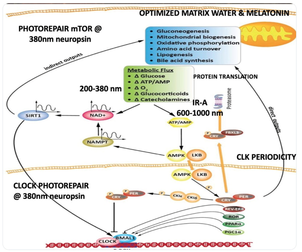 This system connects to a cascade of other biological signals — a photoreceptor in your skin and eyes called Neuropsin (OPN5) that responds to 380nm UV-A light, hormone signals from a brain pathway called POMC/alpha-MSH, your body's master circadian clock, the suprachiasmatic nucleus (SCN), and the excretion routes — skin and gut — that flush out whatever melanin has captured.