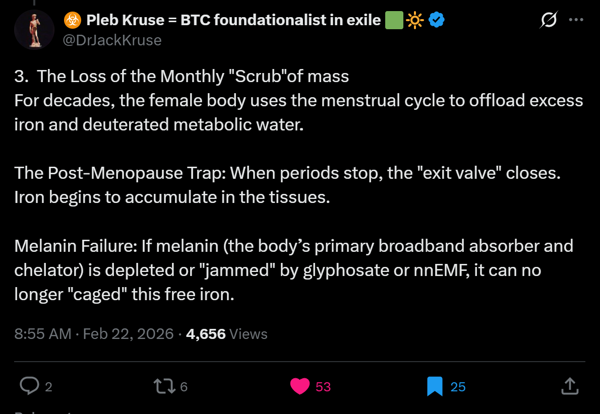 Kruse posted on February 22nd specifically about what this means for women after menopause: for decades, the female body uses the menstrual cycle to offload excess iron — a monthly clearing mechanism. When that cycle ends, that exit valve closes. Iron starts accumulating in tissues. If melanin has been compromised — by glyphosate, by chronic indoor living, by years without adequate UV exposure — it can no longer manage that accumulating iron. Free iron in tissues generates a cascade of oxidative damage — the chemical equivalent of rust forming inside your cells — that accelerates mitochondrial deterioration across every organ.