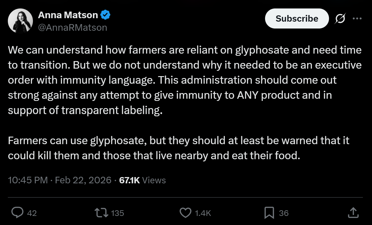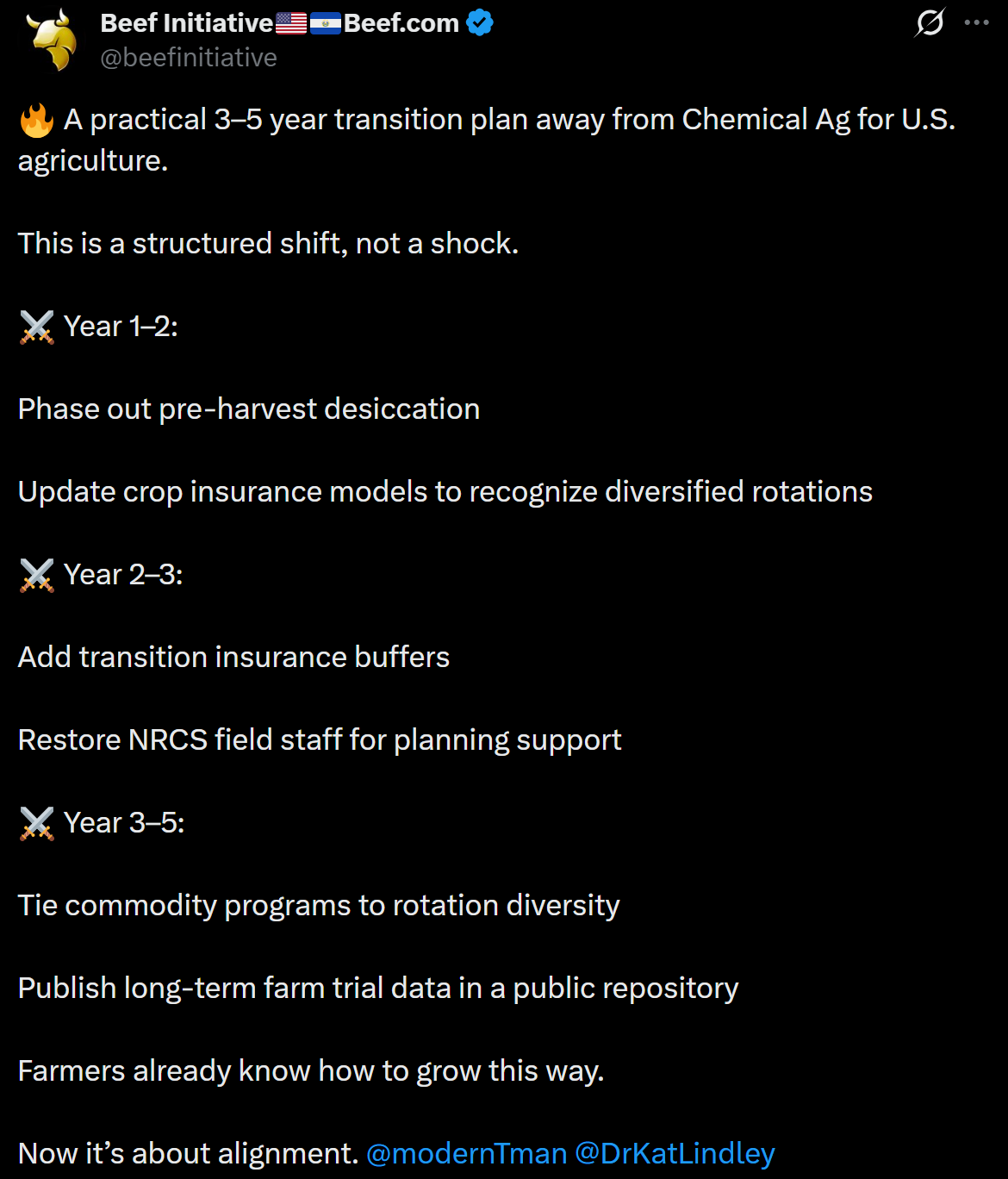 The Beef Initiative (@beefinitiative) posted one of the more practically grounded responses to the executive order: a structured 3–5 year transition plan away from chemical agriculture that doesn't require a shock to the food system. Their point was that the logistical argument for glyphosate dependency — that farmers simply can't survive without it — is a manufactured constraint, not a natural one. The infrastructure that made chemical agriculture the default was built deliberately, financed deliberately, and can be unwound deliberately. The plan exists. The will is what's being manufactured against.