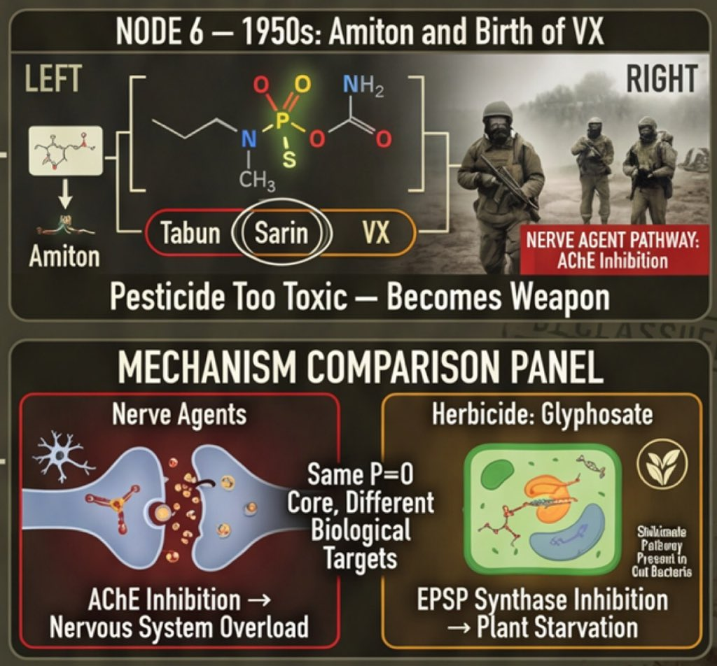 Dr. Henry Ealy made the corporate lineage even more explicit in his response to Kennedy's thread on X, calling Bayer-Monsanto "aka IG Farben aka Nazi Germany" — a reference to the fact that the chemical conglomerate IG Farben, which produced Zyklon B during World War II and conducted chemical weapons research for the Nazi military, was broken up after the war into constituent companies that included Bayer. The organophosphate nerve agent research that IG Farben and affiliated German chemists conducted in the 1930s and 40s — producing sarin, VX, and related compounds — became the scientific foundation from which the organophosphonate class of chemicals, including glyphosate, was later developed. The phosphorus backbone is the same family of chemistry. This is not a fringe claim or a metaphor. It is the documented chemical lineage of the compound now designated a U.S. national security asset.