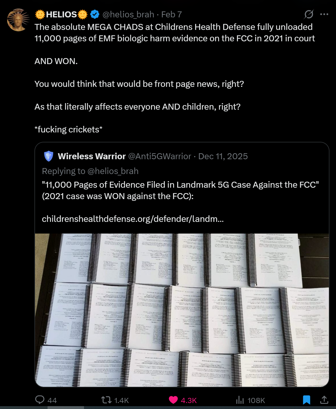 The FCC lost. The evidence was submitted. The biological harm is documented. Yet mainstream silence persists because admitting nnEMF harms biology would unravel the entire telecommunications infrastructure—and by extension, the geoengineering operations that make that infrastructure "safer" to deploy.