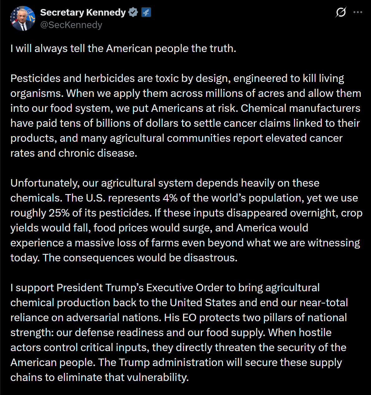 Secretary Kennedy's response on X was long, and in places honest. He acknowledged that pesticides and herbicides are "toxic by design, engineered to kill living organisms." He noted that Monsanto and Bayer have paid "tens of billions of dollars to settle cancer claims" while agricultural communities show elevated cancer and chronic disease rates. He pledged a transition toward regenerative agriculture, laser-guided weed control, and a phase-out of pre-harvest desiccation.