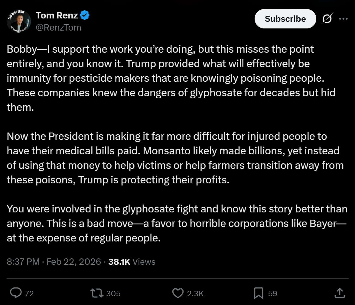 The immunity language in the executive order is not a bureaucratic footnote. It means injured farmers and their families have fewer legal paths to hold accountable the companies that poisoned them knowingly. Tom Renz called it accurately: this was a favor to corporations at the expense of people.