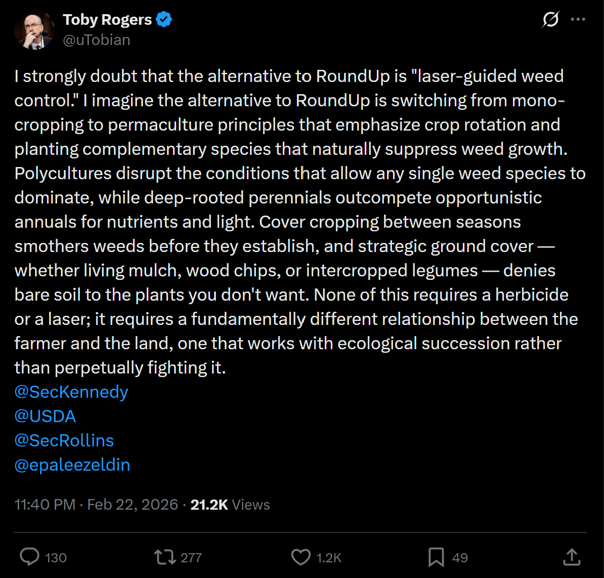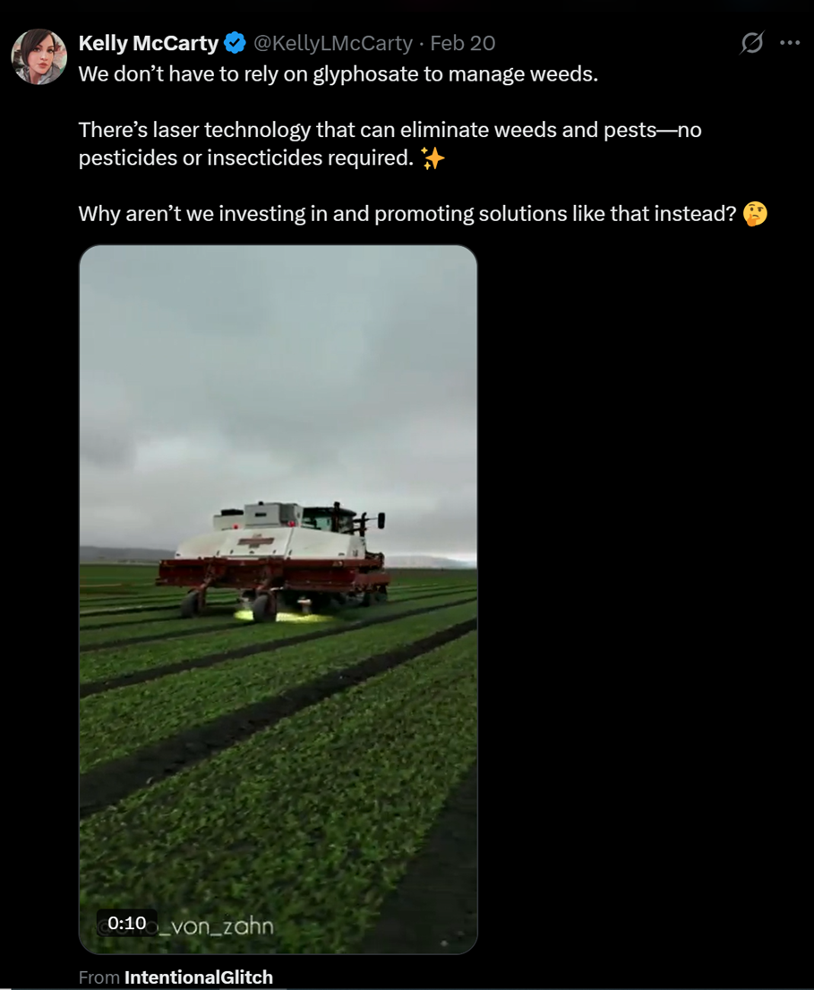 Toby Rogers went further still, pointing out that the real alternative to Roundup isn't laser weeders — it's permaculture, crop rotation, and planting complementary species that naturally suppress weeds.