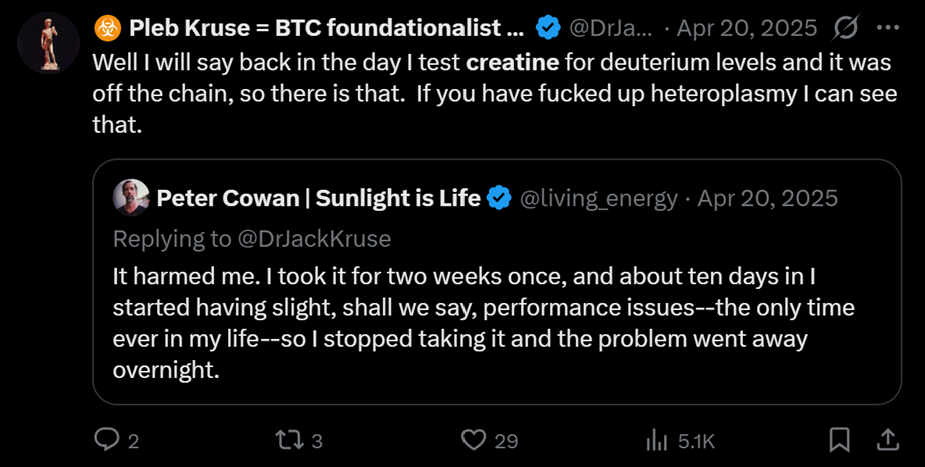 Most commercial creatine is synthesized through industrial chemical reactions that do not exclude deuterium. As Kruse stated plainly in an April 2025 thread: