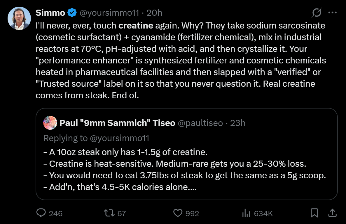 There are few supplements that generate quite the same mix of passionate advocacy and equally passionate ridicule as creatine. Walk into any gathering where Bitcoiners, carnivores, and biohackers intersect and you'll find the believers clutching their Thorne monohydrate like a sidearm and the skeptics, led by none other than Dr. Jack Kruse, who refers to creatine enthusiasts as "smooth brainers" operating at chimp-level biology.