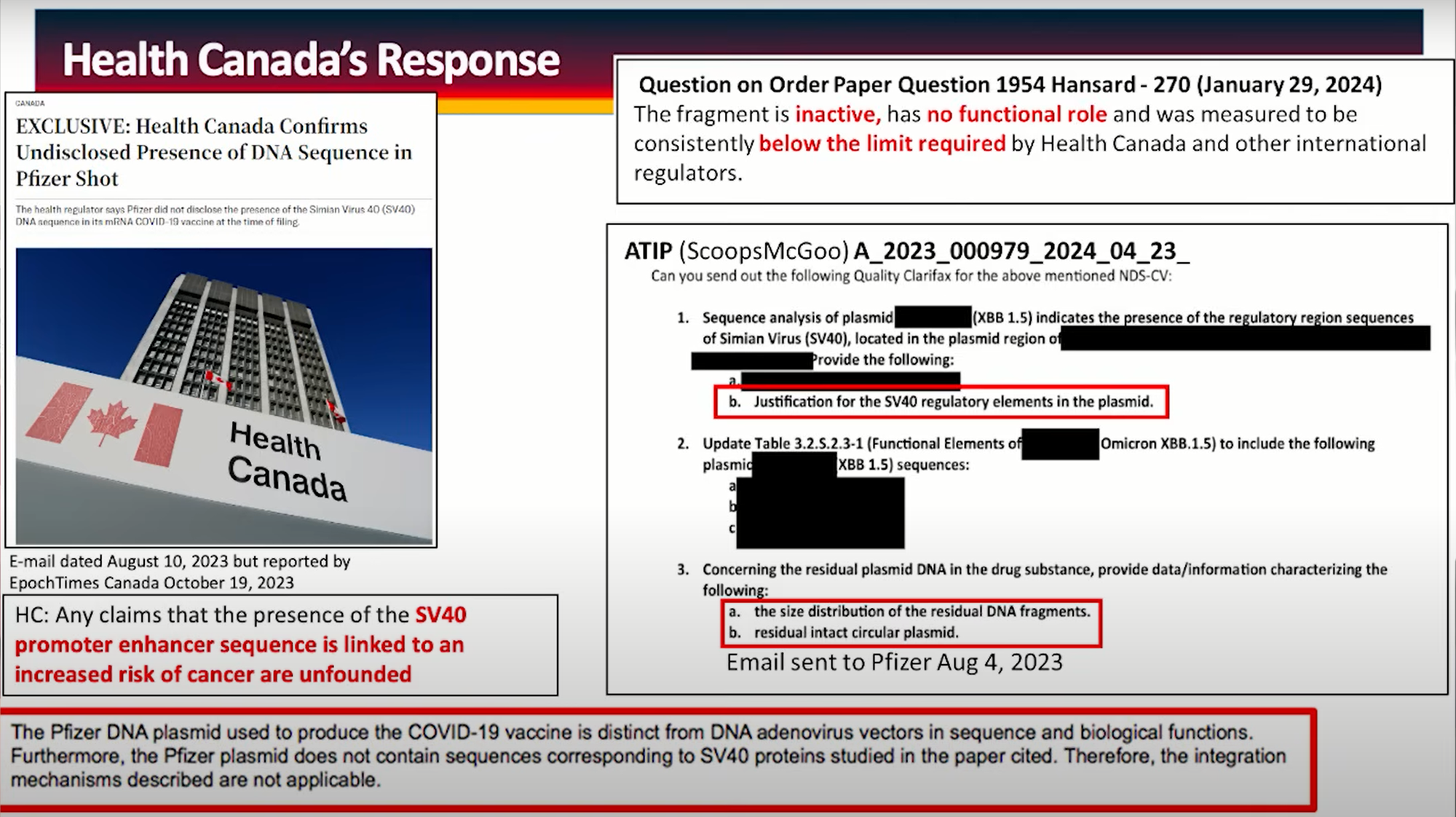 Through freedom of information requests, researchers discovered that Health Canada actually contacted Pfizer asking why the SV40 sequence is there? What is the justification of it, and what is the size of the residual DNA? Health Canada's answer? Essentially a, "don't worry your pretty little head about it. It doesn't do anything" response.
