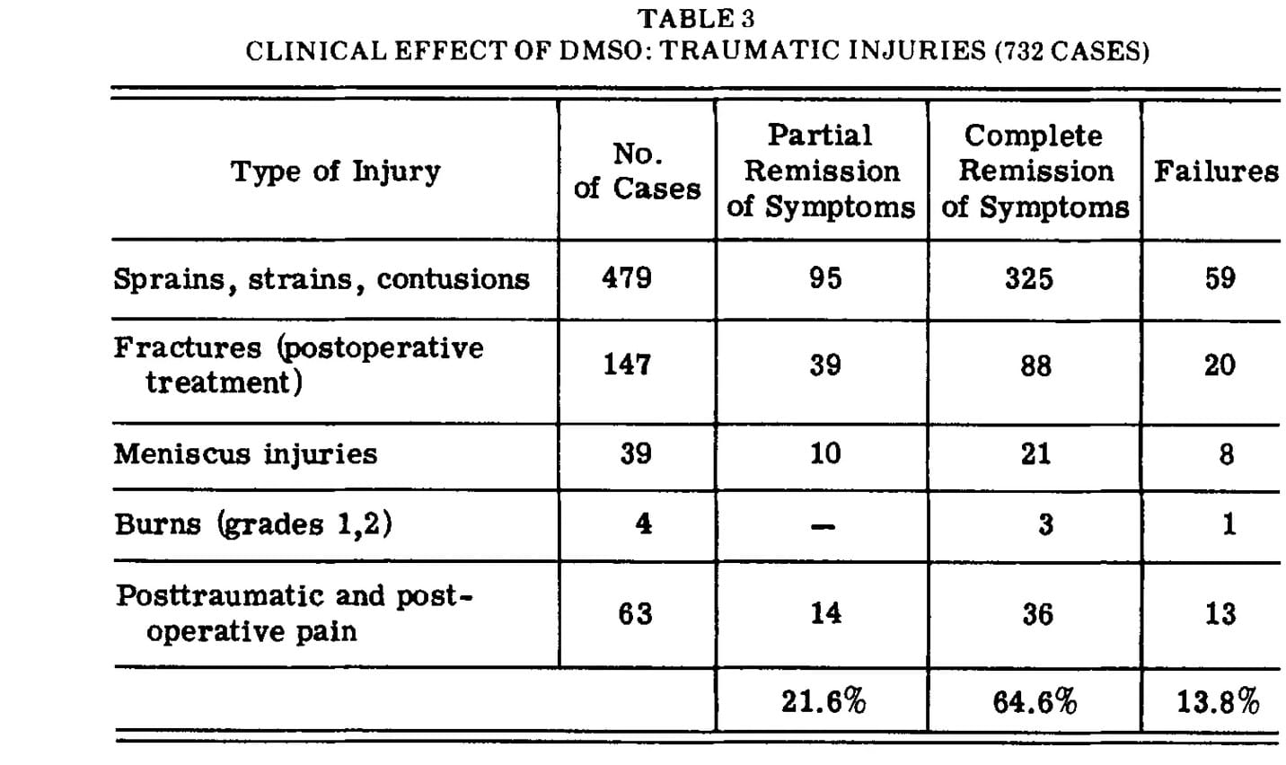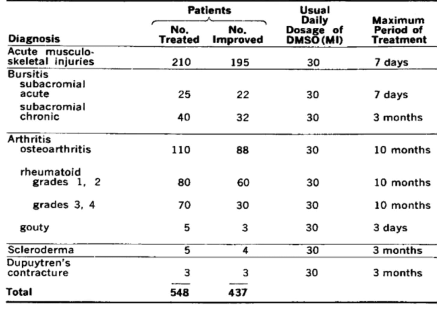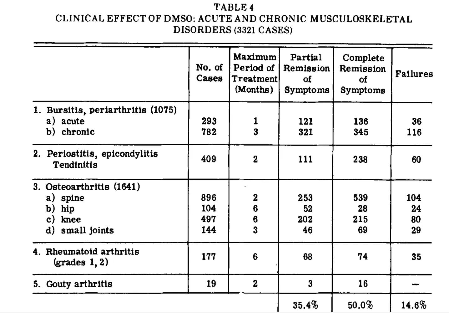 A landmark 1967 study examined DMSO's effects across thousands of musculoskeletal cases using topical applications of varying concentrations. The results consistently showed 80-90% success rates - something dramatically better than any options available then or now, 60 years later.