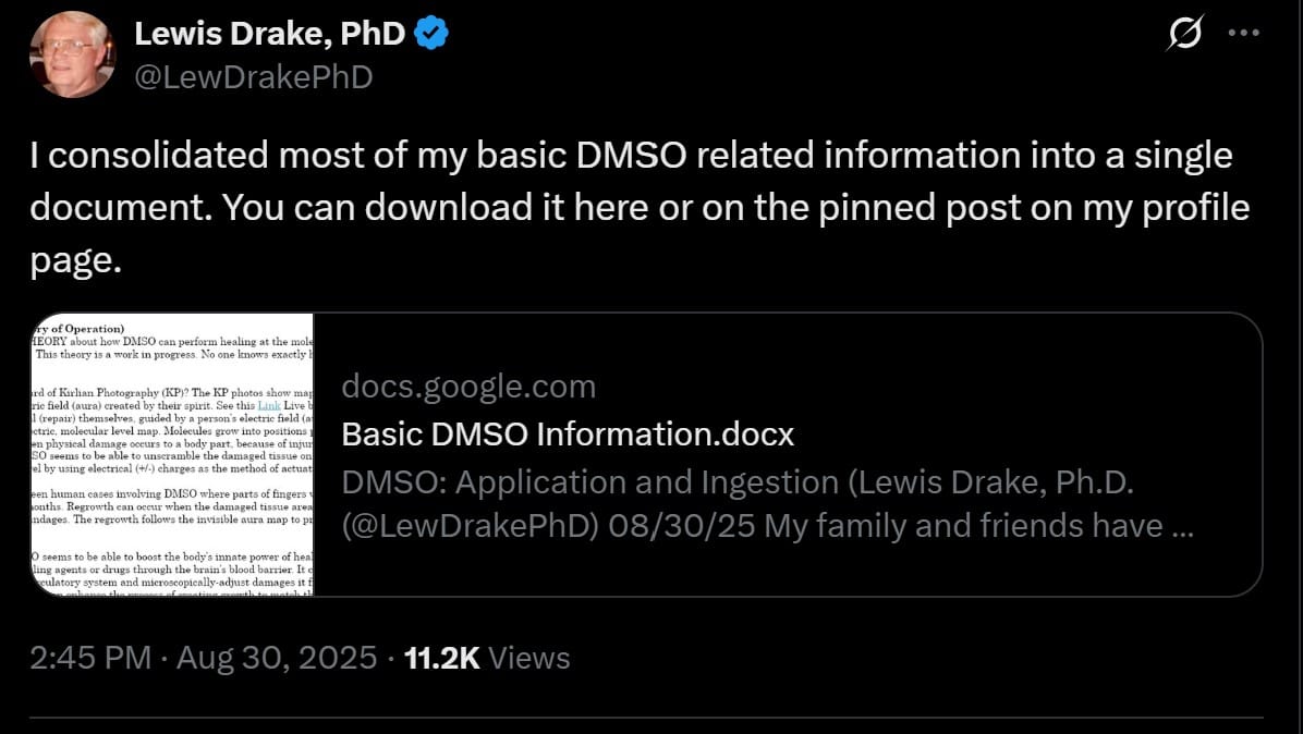 PhD, Lewis Drake, @LewDrakePhD on X, has compiled an 8 page document that distills a lot of DMSO knowledge and findings for both the experienced user and us noobs who want to give it a try.